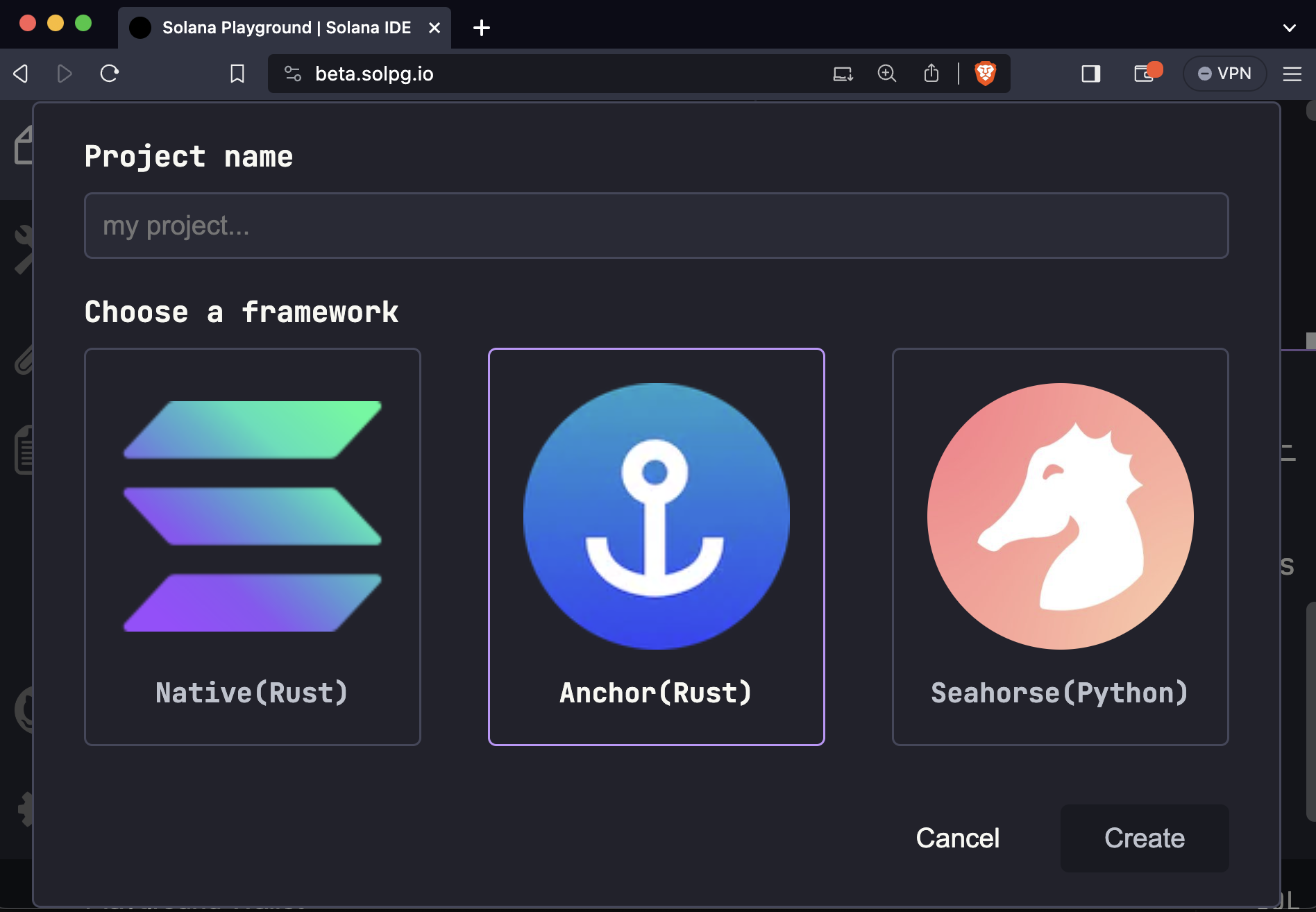 +Enter a project name, select Anchor as the framework, then click the "Create" button.
