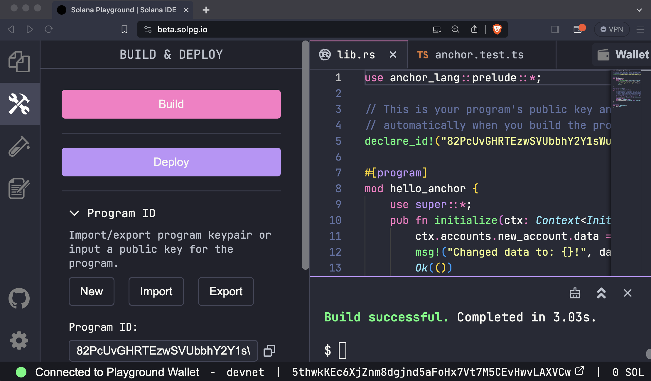 +To build the program, simply run `build` in the terminal. Building the program will update the program address in `declare_id!()`. This is the on-chain address of your program.