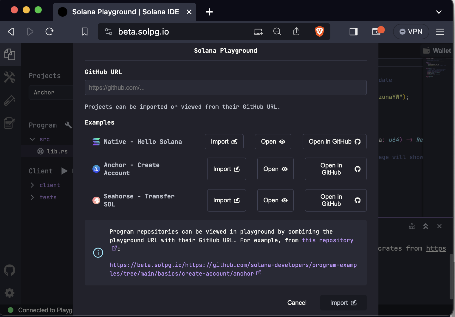 +Solana Playground offers a convenient feature allowing you to import or view projects using their GitHub URLs.