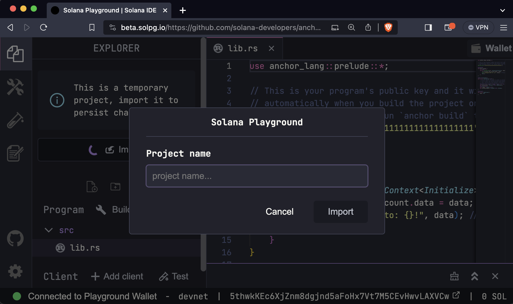 +Click the `Import` button and enter a name for the project to add it to your list of projects in Solana Playground.
